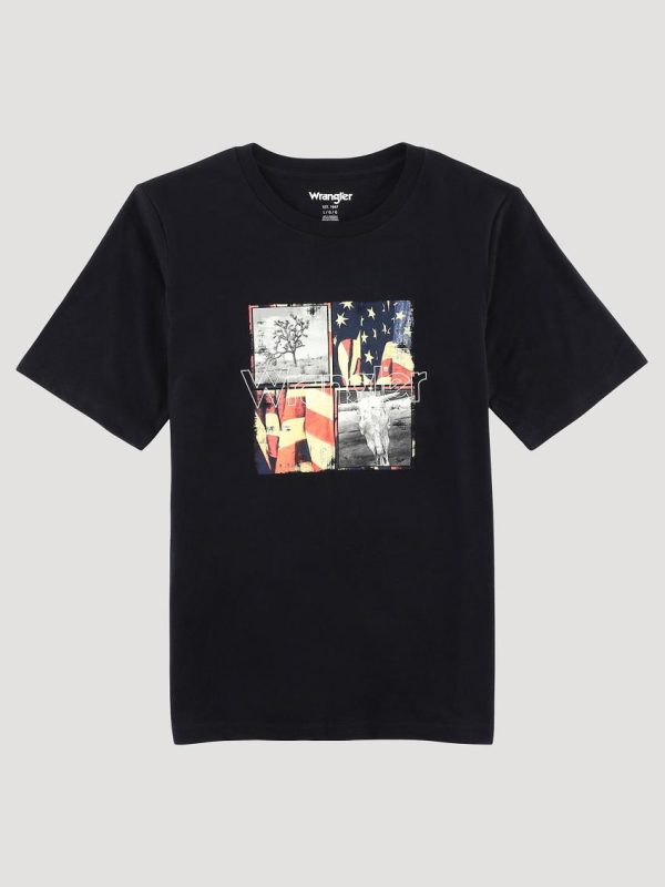 For those all-American boys, celebrate a home-grown childhood with the Wrangler® Americana photos t-shirt. With vintage-inspired pictures of the flag around the Wrangler logo, this soft tee brings a patriotic feel that looks good year-round. Made from a soft cotton blend, it’s made to be worn and worn again as he grows.