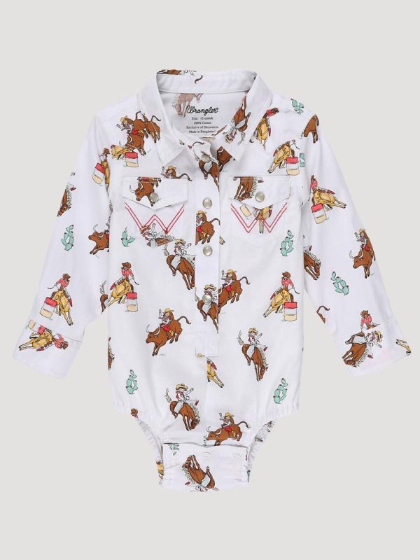 She may not be old enough to ride just yet, but she’ll be ready before you know it! In the meantime, this Wrangler® little girls’ Western snap bodysuit is just what she needs. The bodysuit is authentically styled with pearl snap buttons, ‘W’ pocket stitching, and Western yokes. Its illustration-style graphics feature horses to help her look the part of a professional rider, even if she hasn’t yet taken her first steps.