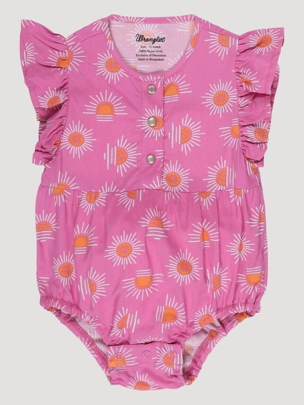 Your little ray of sunshine will look positively adorable in this ruffle sleeve bodysuit. It features a colorful print, ruffled sleeves and shoulders, and a partial button closure placket with pearl snaps for a touch of Western authenticity.