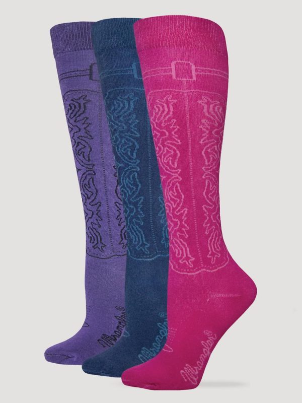 These 3 pack cowgirl boot socks will keep you comfortable throughout the day with stay up leg and top feature and soft nylon and rayon construction. Size M fits women’s shoe size 6-9