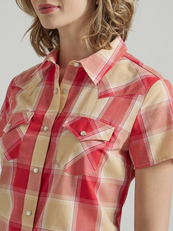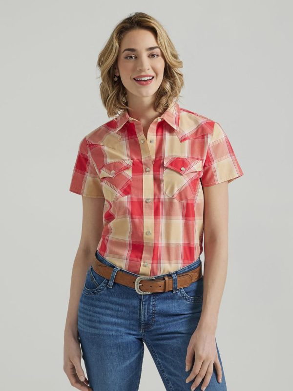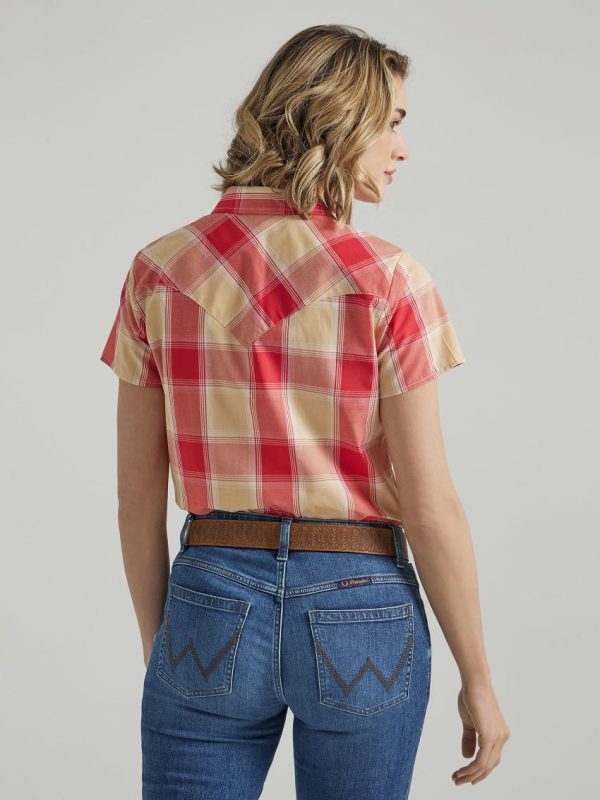 Wrangler® knows you work hard. You need styles that keep up and help you get the job done without compromising on comfort or style. Our women’s short sleeve Western shirt provides plenty of authentic cowgirl style while offering a comfortable cotton fabric blend designed for all-day wear. Classic Western details, including one-point front and back yokes, snap flap pockets, and a pearl snap front closure, add an elevated look that easily transitions from a long day at work to hanging out with friends at your favorite coffee shop. Pair it with your favorite Wrangler® jeans for an authentic Western look that keeps you comfortable and in style.