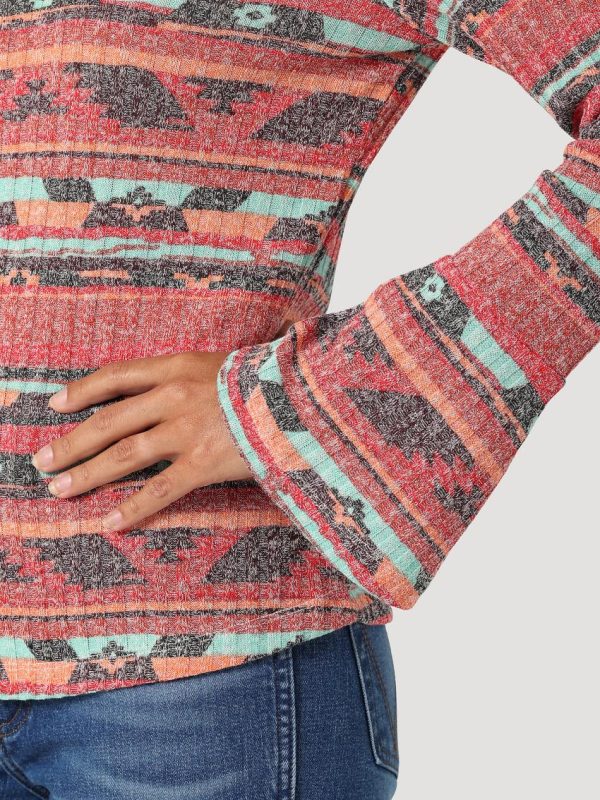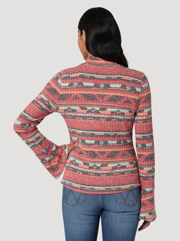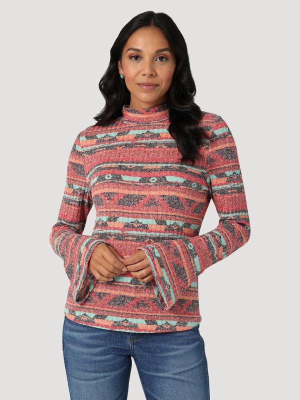 Looking for the perfect mock turtleneck? Our Women’s Wrangler Retro® Geo Flute Sleeve Knit Blouse will add a pop of color to any outfit. It comes with fluted sleeves, a retro-inspired stripe print in southwestern-inspired hues, and a fitted silhouette that easily transitions between the seasons. It’s crafted from a soft fabric blend with just a hint of stretch for added comfort.