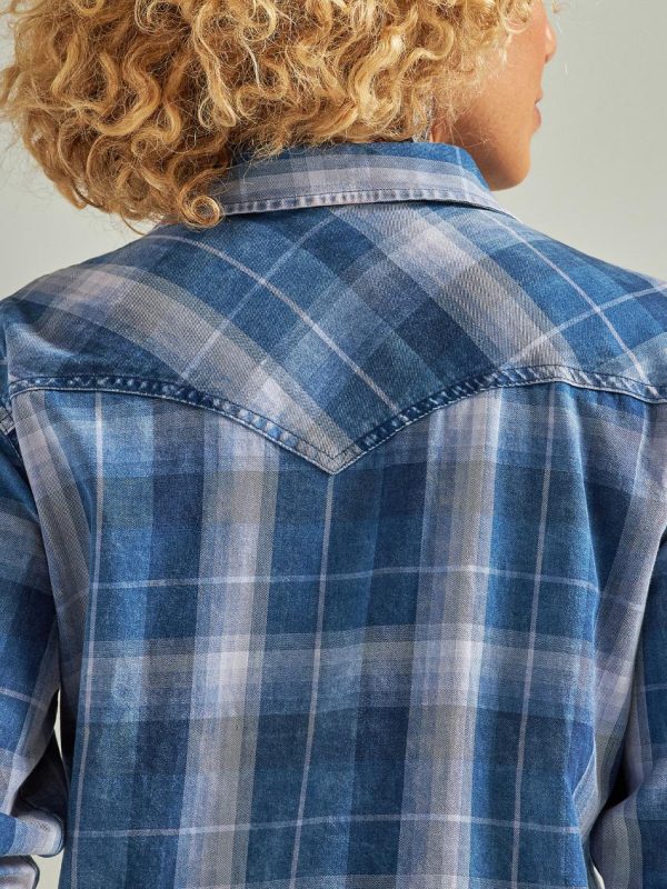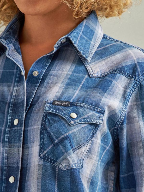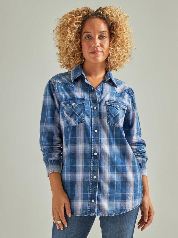 Long Sleeve Western Snap Plaid Denim Shirt Blue Plaid | Women Wrangler Snaps & Button Downs