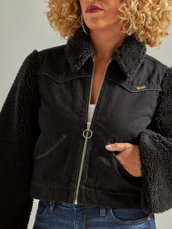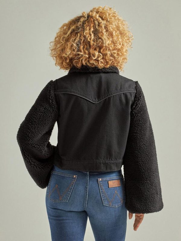Add some unique flavor to your wardrobe with the Women’s Wrangler Retro® Denim Contrast Sleeve Jacket. This black denim beauty is designed with a warm sherpa collar and extra-wide sherpa bell sleeves that will stand out anywhere and always keep you warm. With a cropped denim body, this jacket offers a balance of cozy flair and modern style. The iconic “W” pocket stitching, back yoke, and Wrangler® branding give this jacket an authentic Western touch.