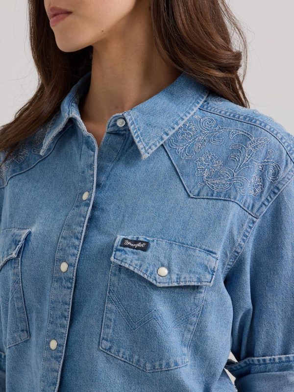 With a familiar fit that’s been borrowed from the boys and a style that’s specifically for the girls, our women’s Wrangler Retro® Western snap shirt can do no wrong. This long sleeve wardrobe staple comes with all the classic details you know and love, including a pointed front and back yoke, snap flap spade-shaped pockets, and a pearl snap closure. What makes this shirt extra special and worthy of a test ride at the rodeo is its colorful embroidery along the shoulders. Wear it lose, tucked into your favorite Wrangler® jeans or tie it up into the perfect knot.</P