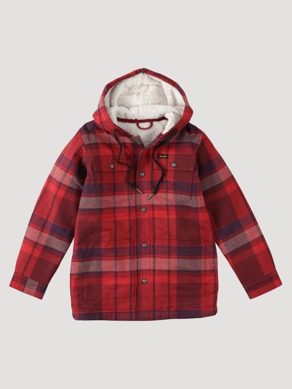 In the season ahead, our Boy’s Wrangler® Sherpa Lined Flannel Hooded Shirt Jacket will help him shake off the cold in style. It’s crafted from 100% cotton with a full sherpa lining for extra warmth. This hooded shacket also comes with two chest pockets with flaps, two side-entry hand pockets, and a full snap front closure for easy layering.