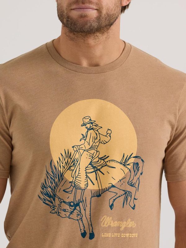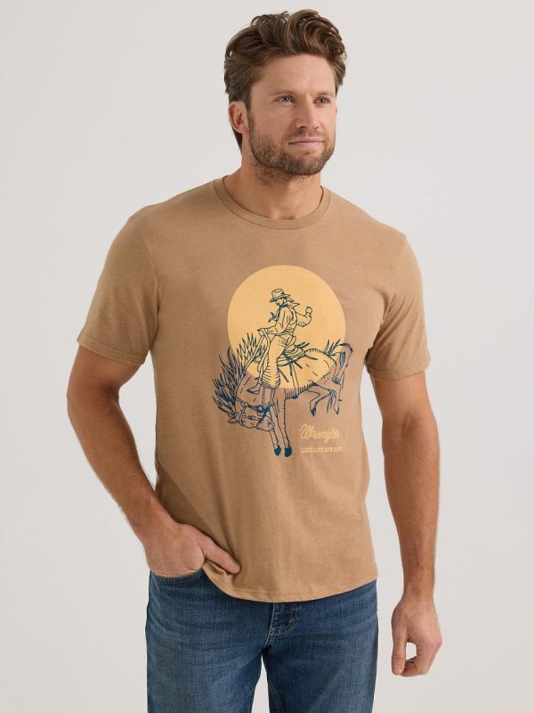 The thrill of the ride, captured in an effortlessly cool and comfortable t-shirt. This vivid graphic tee features a roping motif filled in with a colorful, rich Western landscape background. The timeless bucking bronco t-shirt is just what you need for those days when you want something stylish that’s easy to throw on before heading out the door.