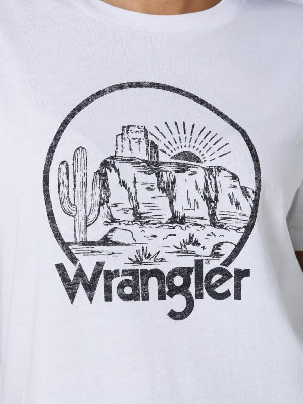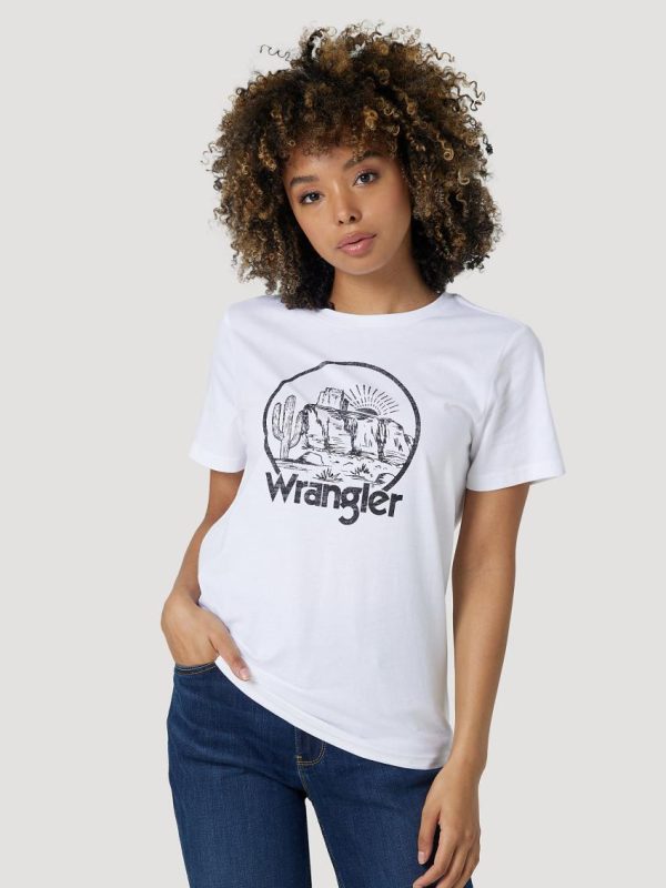 Effortless style with a vintage vibe. This women’s Wrangler short sleeve watercolor desert graphic tee channels everything we all love about the southwestern landscape: cacti, mesas, and the majestic sunset. It comes with the tried-and-true Wrangler® logo, a classic crew neck, and a cotton jersey feel that’ll keep you comfy all day long. Best of all, you can wear it loose, tuck it into your favorite pair of jeans, or tie it into the perfect knot.