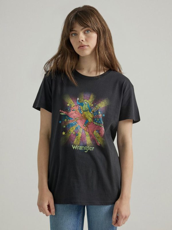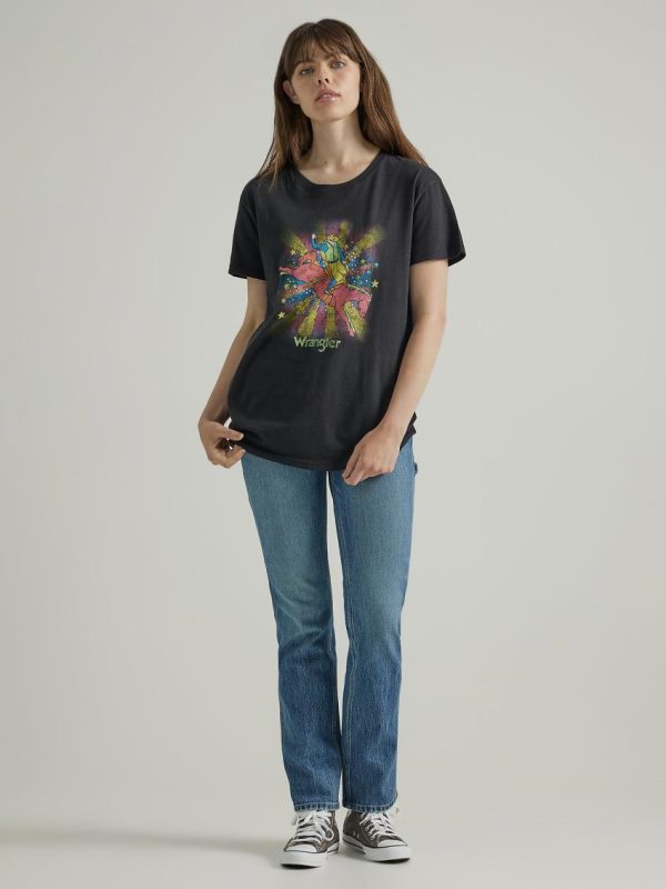 Combining our most comfortable fit with a Western-inspired look, the Women’s Space Cowgirl Tee is destined to become a new favorite. It features a boyfriend fit with a looser look and feel for that worn-in quality you want from the start. This scoop neck tee comes with a colorful and slightly psychedelic graphic across the chest of a cowboy on the back of a bucking bronco.