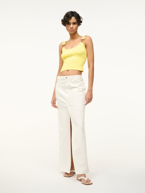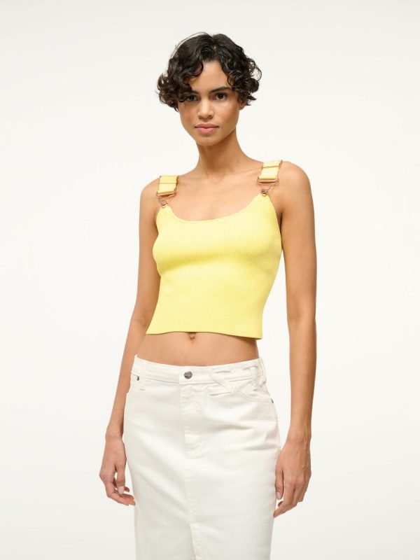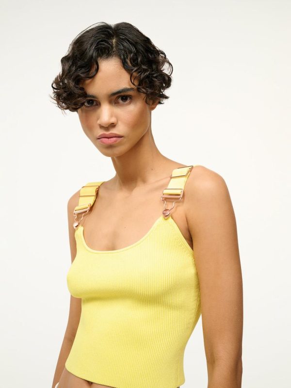 The Overall Knit Top is an easy pull-on sleeveless top in a fitted ribbed fabrication and features adjustable overall-style straps.