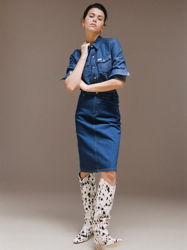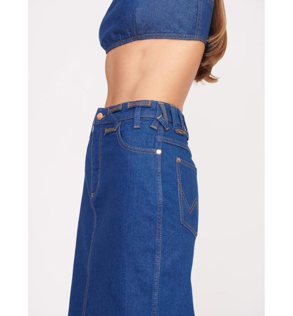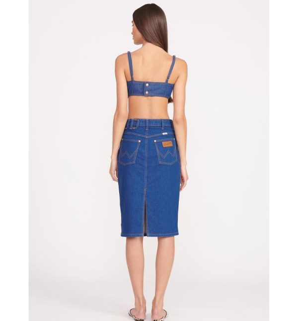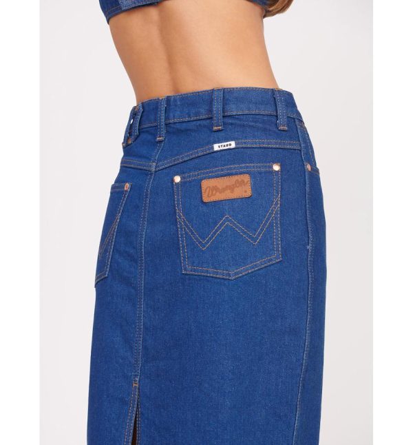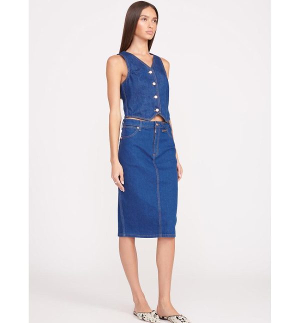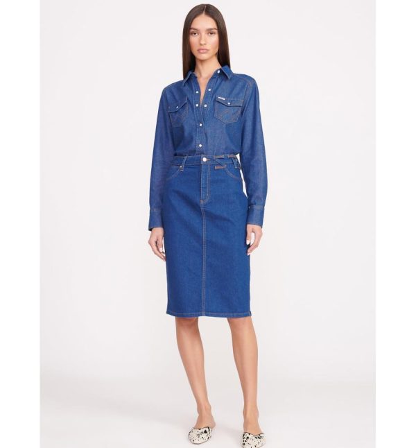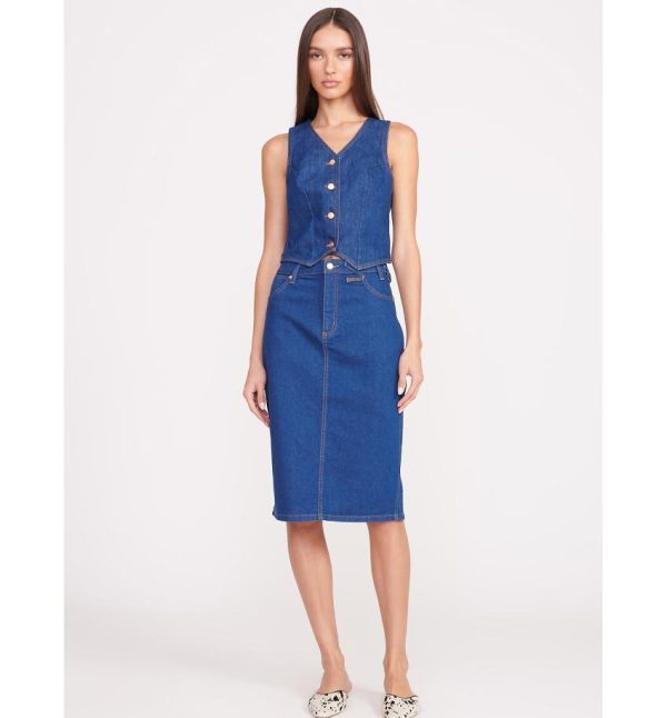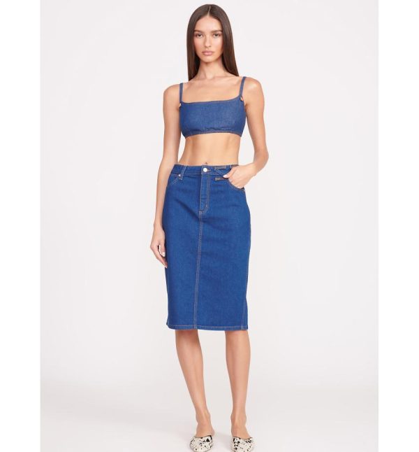 The Pencil Skirt is our perfectly sexy jean skirt. The midrise sits just below the natural waist and has a button and zip fly closure. This style features our STAUD belt loop detail at the waist and a back slit.