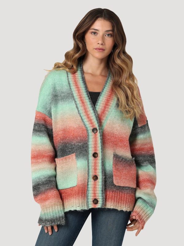 You’ll look for any excuse to bundle up in our Women’s Wrangler Retro® Watercolor Cardigan. This cozy sweater comes with all the beautiful hues of a southwestern sunset in ombre stripes to set your look apart. It also features dropped shoulders, ribbed trim, two lower pockets, and a button-up silhouette that’s perfect for layering.