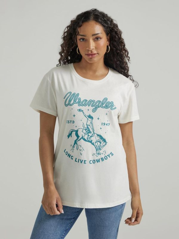 Long Live Cowboys. Our Women’s Wrangler Retro® Western Graphic Boyfriend Tee comes with a retro-inspired graphic that celebrates our Western heritage and those cowboys we love. It’s crafted from a buttery soft cotton blend for comfort and cut with a boyfriend fit for a slightly oversized look that feels lived in and well-loved, no borrowing from the boys required.