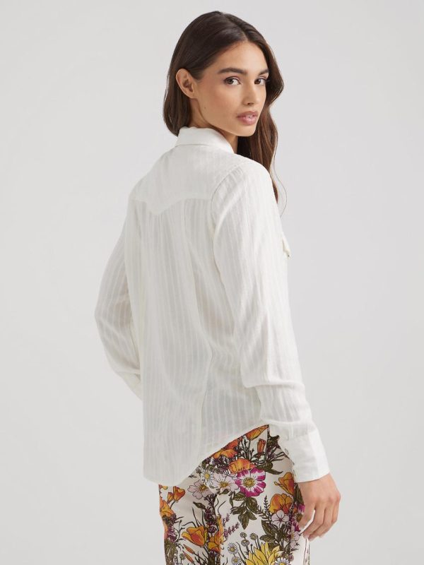 For those looking for a more feminine take on the classic Western shirt, try the Wrangler® Slim Fit Western Shirt on for size. This sweet white button-down comes with our classic pearled snaps, and a slimmer fit than usual to really hug your curves. Washed in subtle white stripes, it adds a little extra dimension to your basic white blouse.