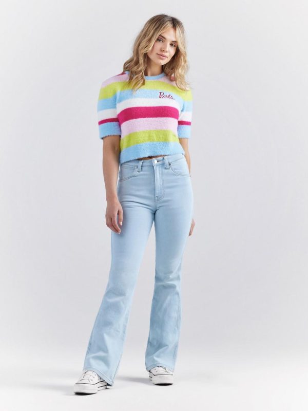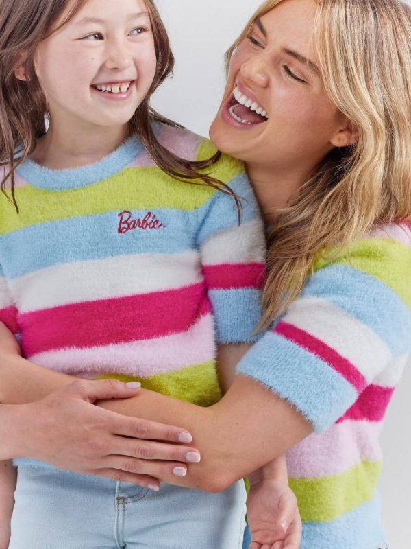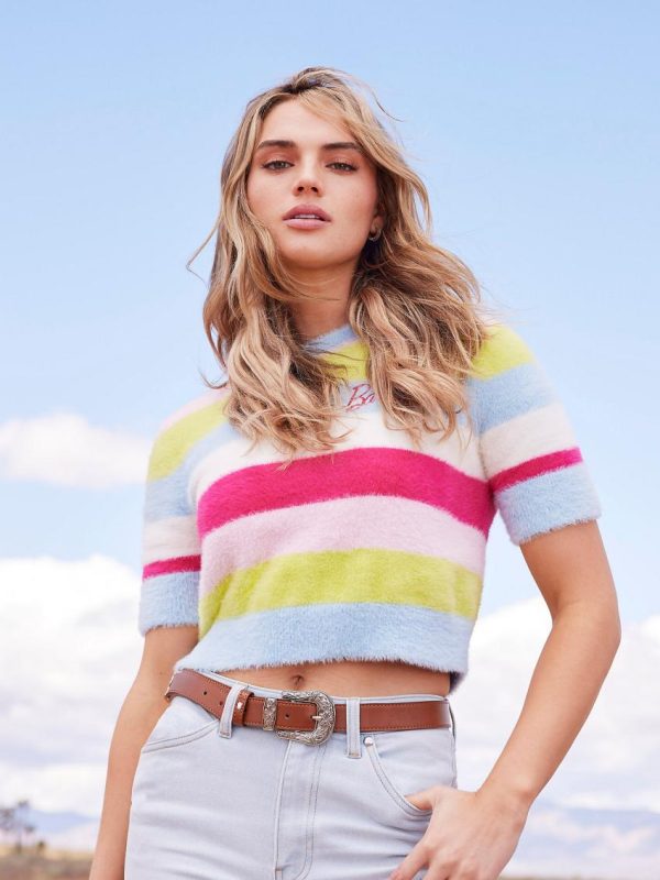 Show them your stripes. Your most colorful stripes. Wrangler® x Barbie™ Cropped Fuzzy Rainbow Sweater offers a modern crop silhouette and horizontal wide hero stripe. This look channels the Barbie™ iconic style softly as it does colorfully with its embroidered Barbie™ logo accent and 100% nylon fuzzy construction. Barbie™ herself would have in her closet if it came in doll-size.