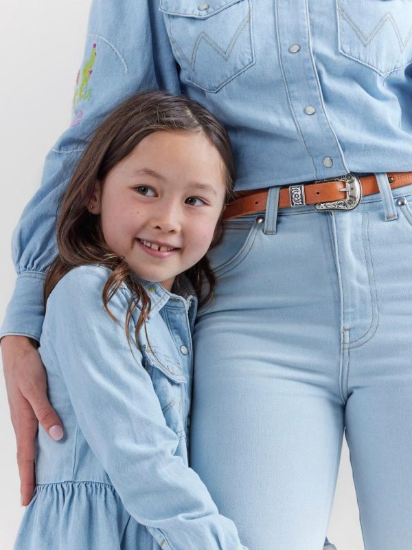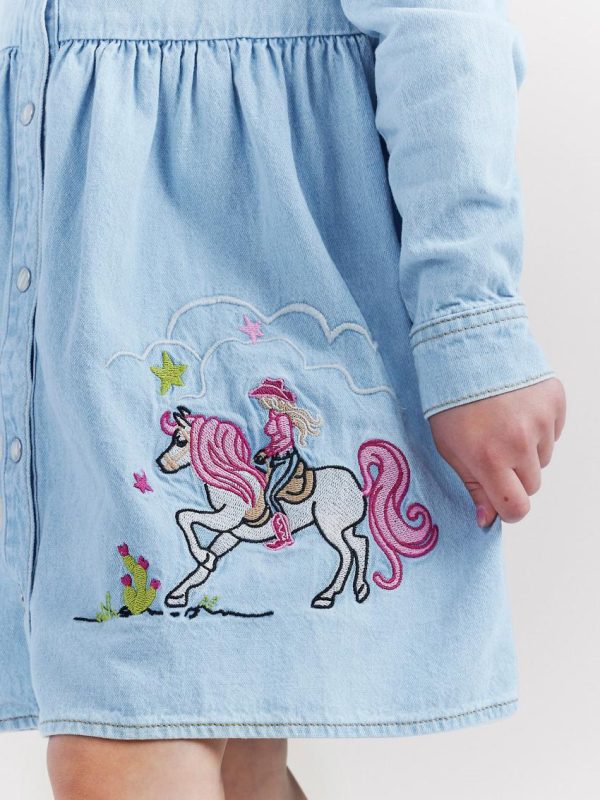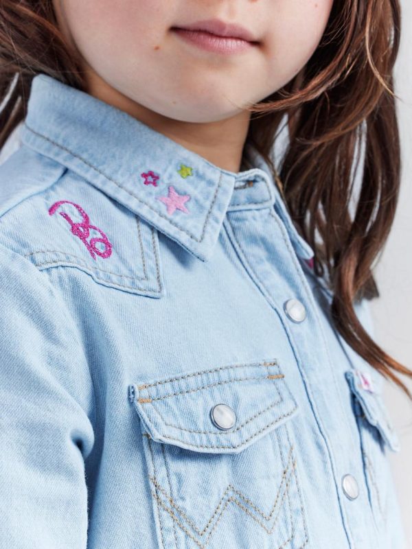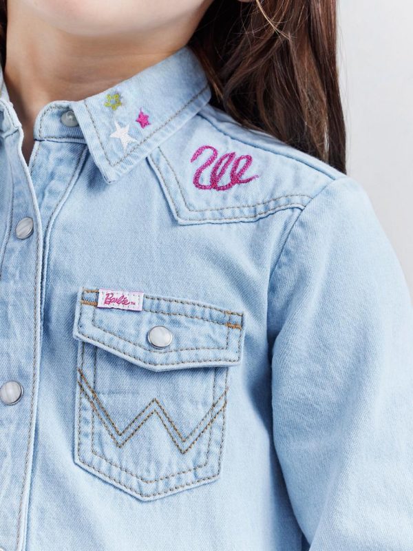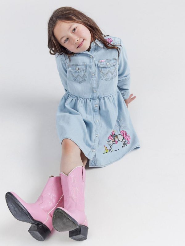 Who doesn’t dream of horseback adventures? Wrangler® x Barbie™ have paired up, creating a dream anything, be anything collection. This 100% cotton, snap-front shirt dress features authentic Western yokes and stitching, along with embroidered embellishments and Barbie™ riser logo exclusive to this collection. The girl wearing it will be just as confident as Barbie™ herself riding horseback. Because pink and blue are strong style companions.